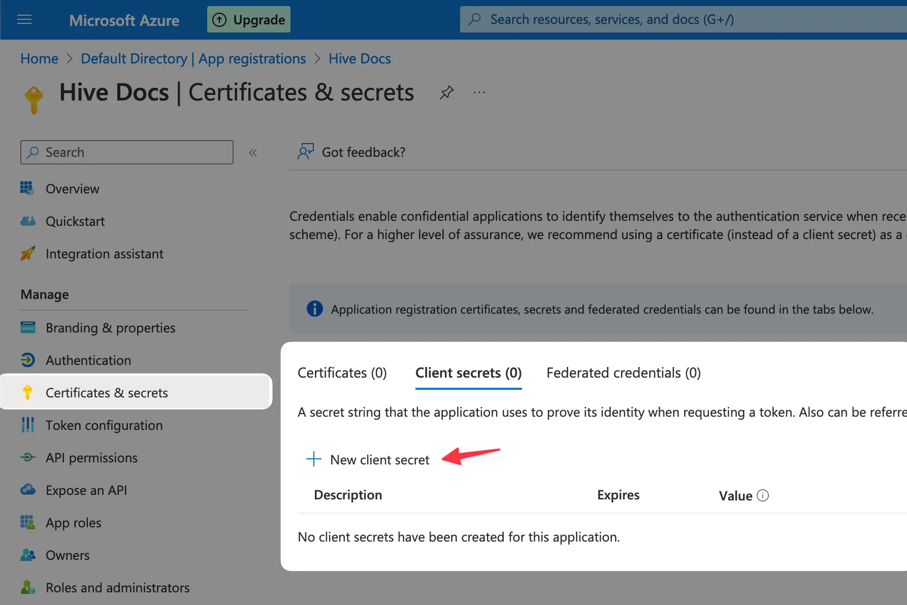 Copy and store your client secret value. Make sure to copy the value immediately, as you’re not gonna be able to see it again after navigating.